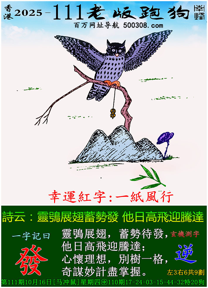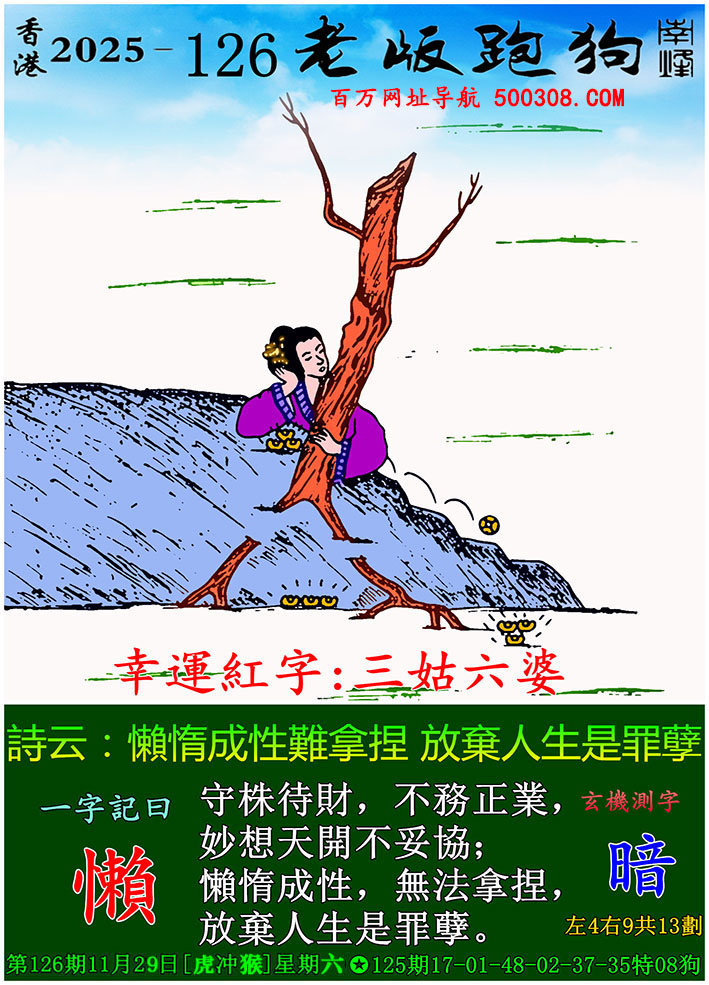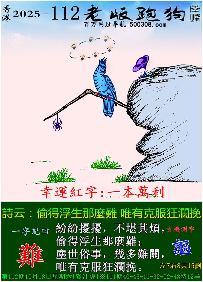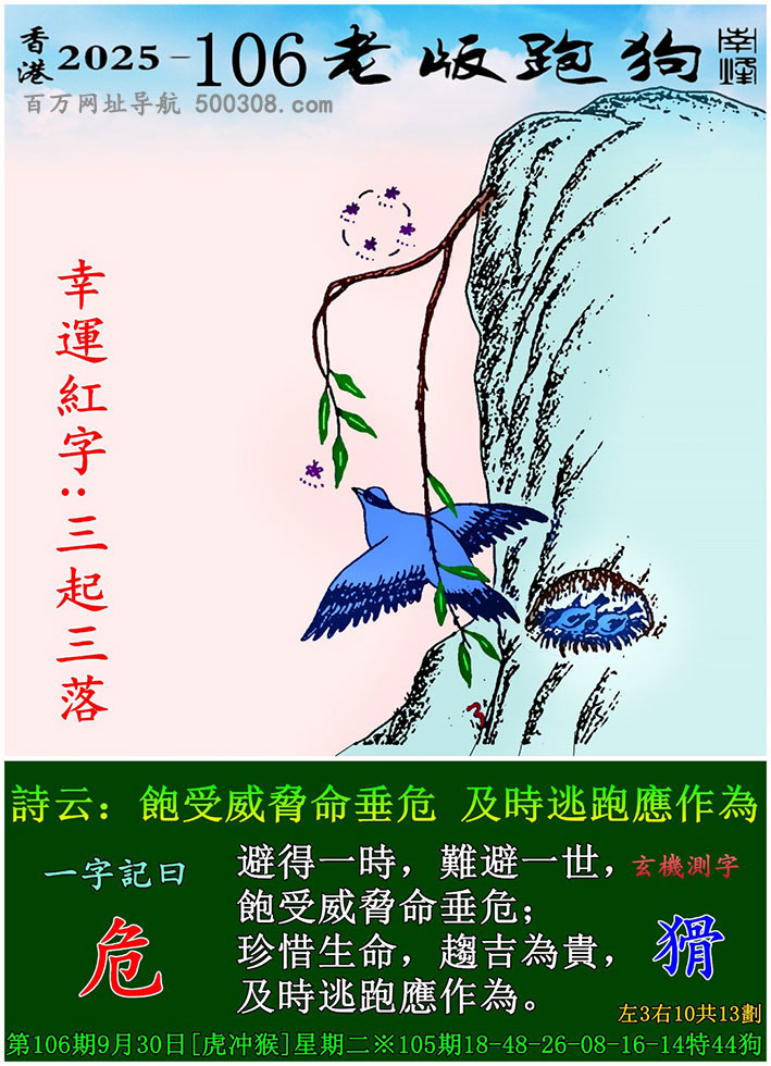 126期跑狗图:一字記之曰:【飛】 疏星壹點,倦鳥翩翩。 夜闌風靜,飛落雲邊。玄機測字:《胖》 一語中特:三姑六婆
