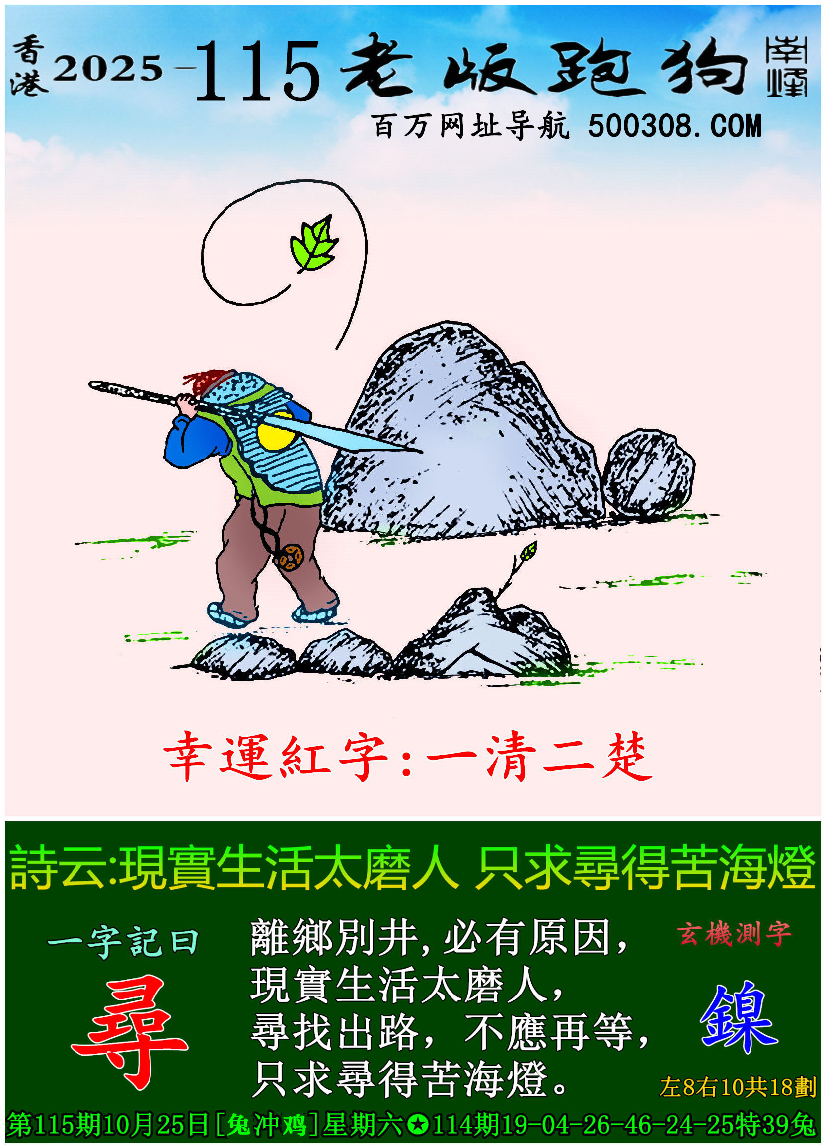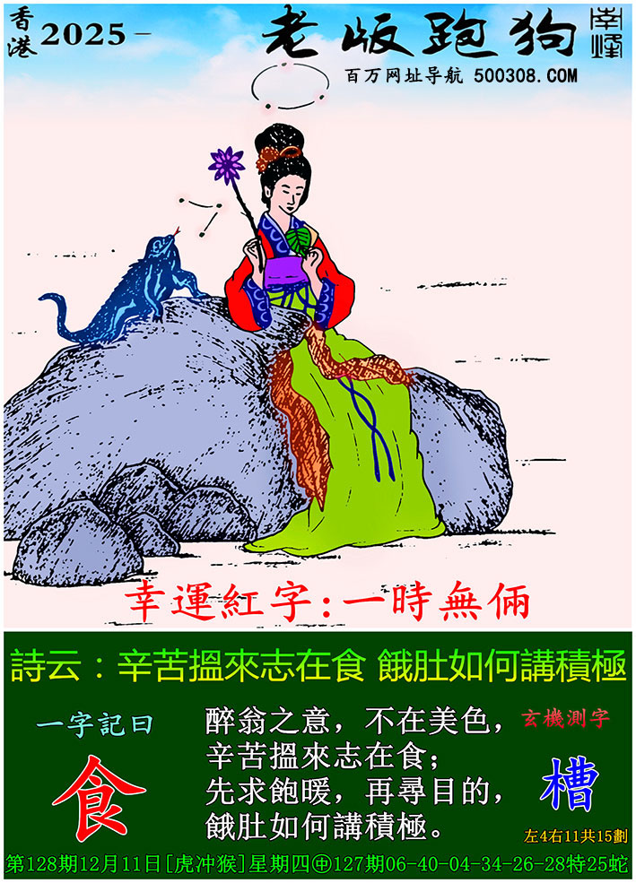 128期跑狗图:一字記之曰:【取】 途失壹履,心憂步遲。 回身覓跡,急趨往取。玄機測字:《炳》 一語中特:一五一十