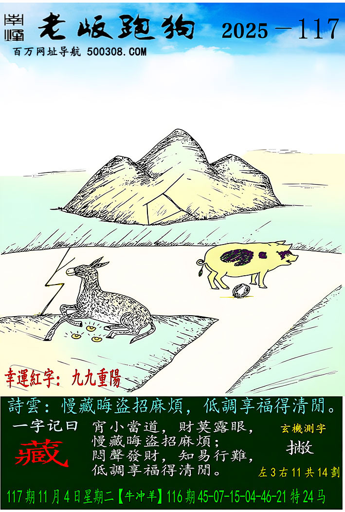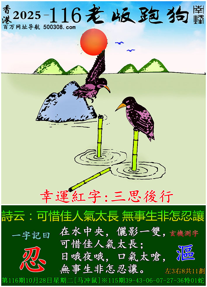 129期跑狗图:一字記之曰:【阱】 枝上昏鴉,鳳影掠過。 暗阱藏伏,命入絲弦。玄機測字:《佈》 一語中特:三五成群