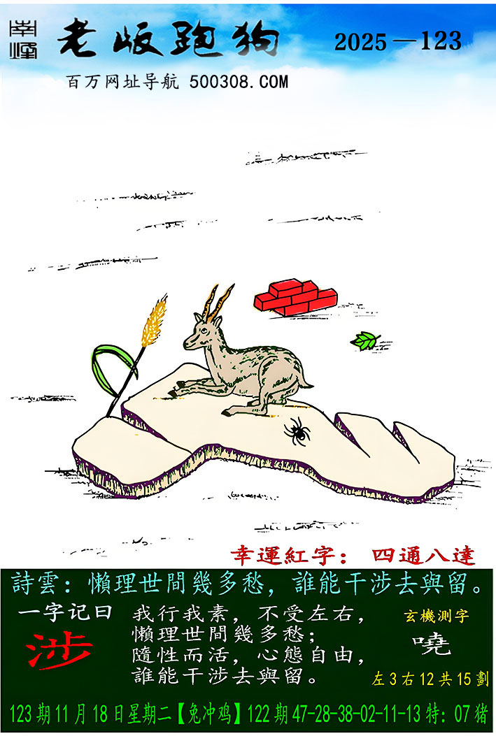 127期跑狗图:一字記之曰:【阻】 袋鼠輕蹦,絨球難阻。 隔障難阻,戲樂無窮。玄機測字:《淺》 一語中特:四方八面