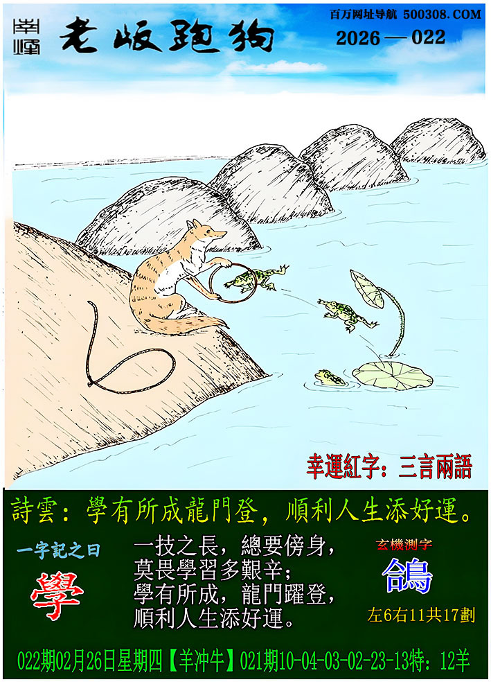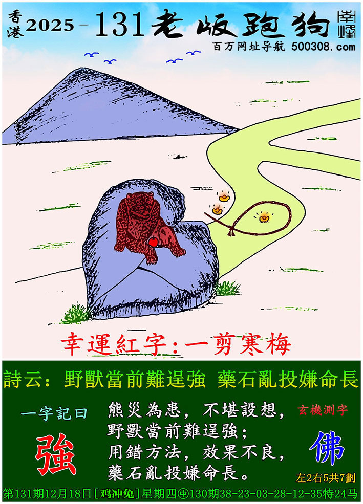 028期跑狗图:一字記之曰:【鶴】 石後藏踪,心隨鶴動。 目注雙禽,卷繩欲牽。玄機測字:《歡》 一語中特:四方八面