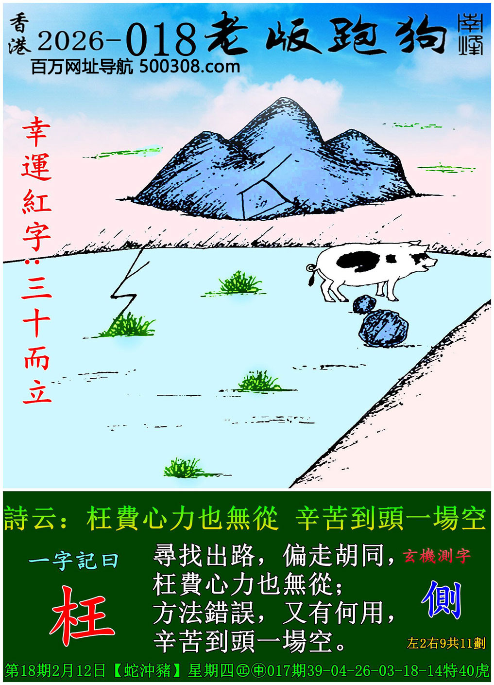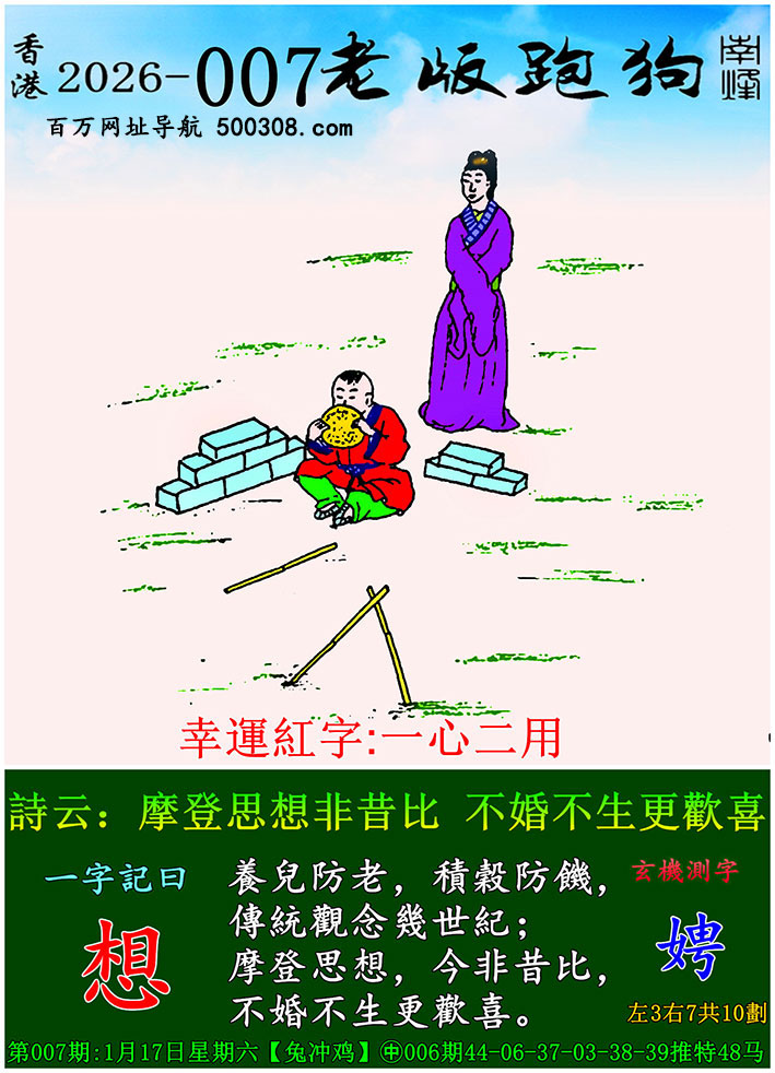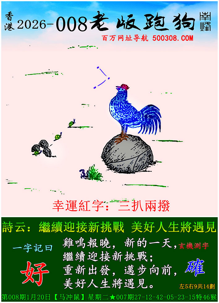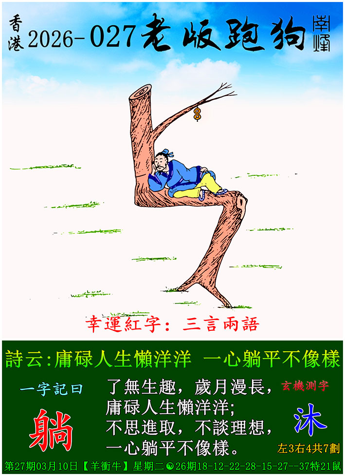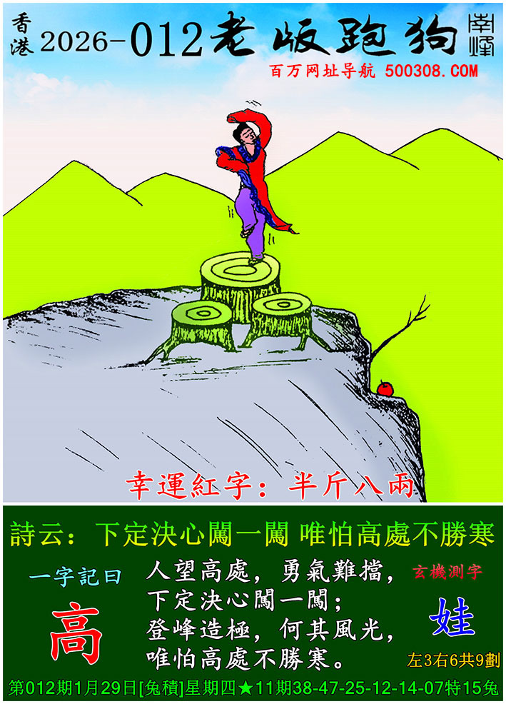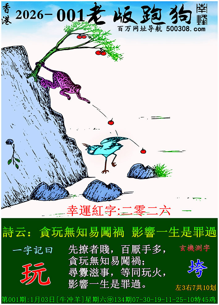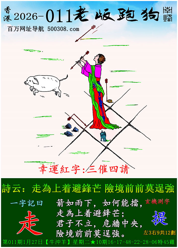 027期跑狗图:一字記之曰:【雙】 不辭萬裏,雙影掠空。 羽剪東風,影落崖層。玄機測字:《跳》 一語中特:三頭六臂